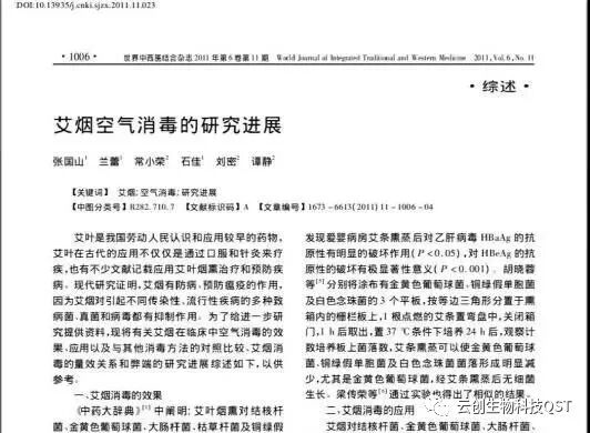 ②国家重点基础研究发展计划973课题由湖南中医药大学常小荣教授主研的《艾烟空气消毒的研究进展》最后的结论:艾烟消毒作为一种行之有效的空气消毒方法,对多种病原微生物具有杀灭作用。
