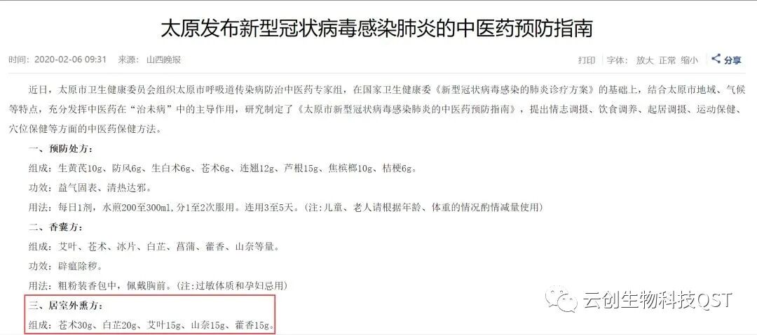山西省人民政府于2月6日发布《太原发布新型冠状病毒感染肺炎的中医药预防指南》,公布了居室外熏方,目的避秽解毒。