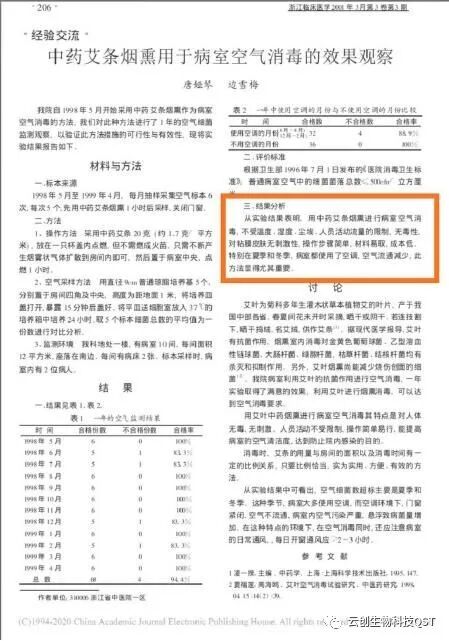 ①《浙江临床医学》2001年3月第三卷第三期唐娅琴、边雪梅的研究报告《中药艾条烟熏用于病室空气消毒的效果观察》;